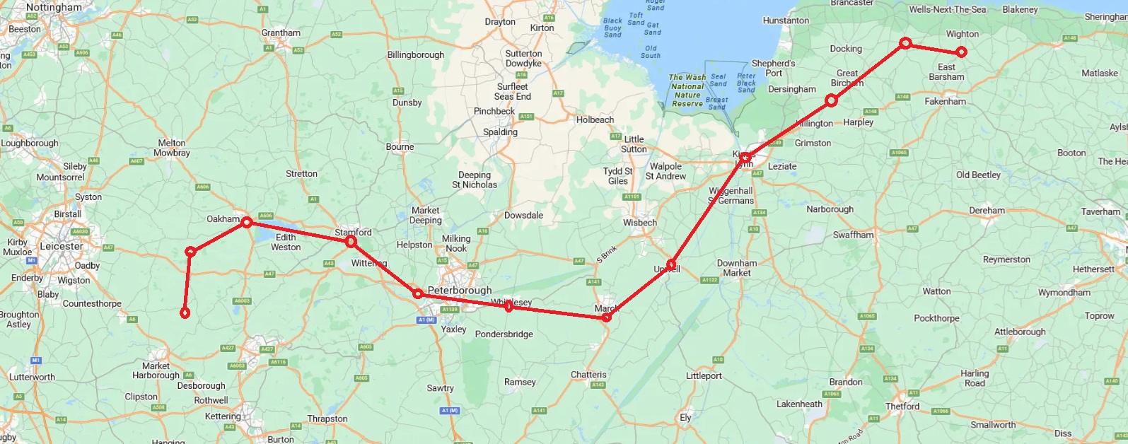 The route is well served by public transport with trains in the West and Buses in the East. There are railway stations at Oakham, Stamford, Peterborough, Whittlsea (sic), March and Kings Lynn. Buses also reach Upwell, Anmer and Walsingham. There are also Uber taxis operating in the vicinity of Market Harborough, Peterborough, March and Kings Lynn.